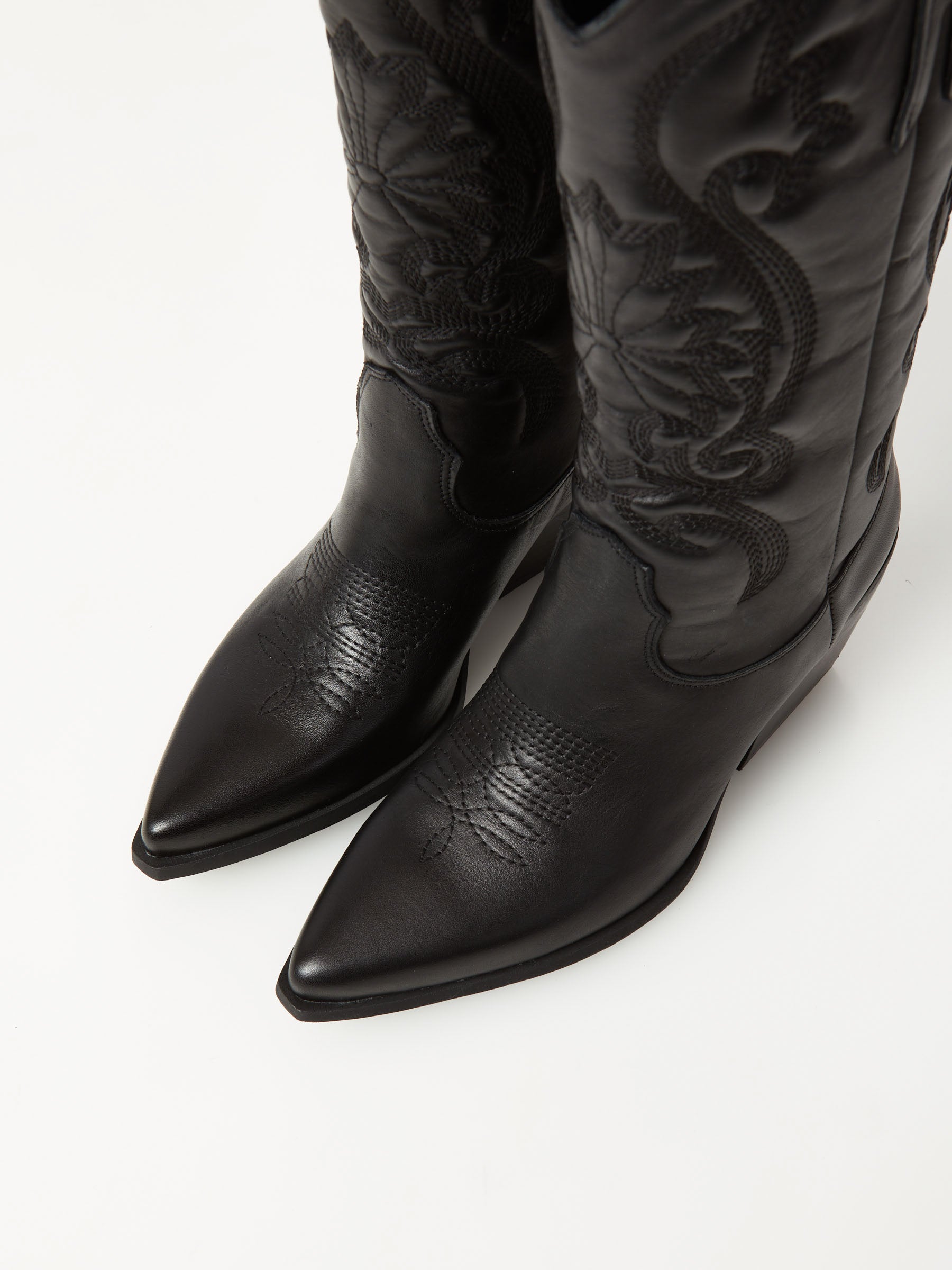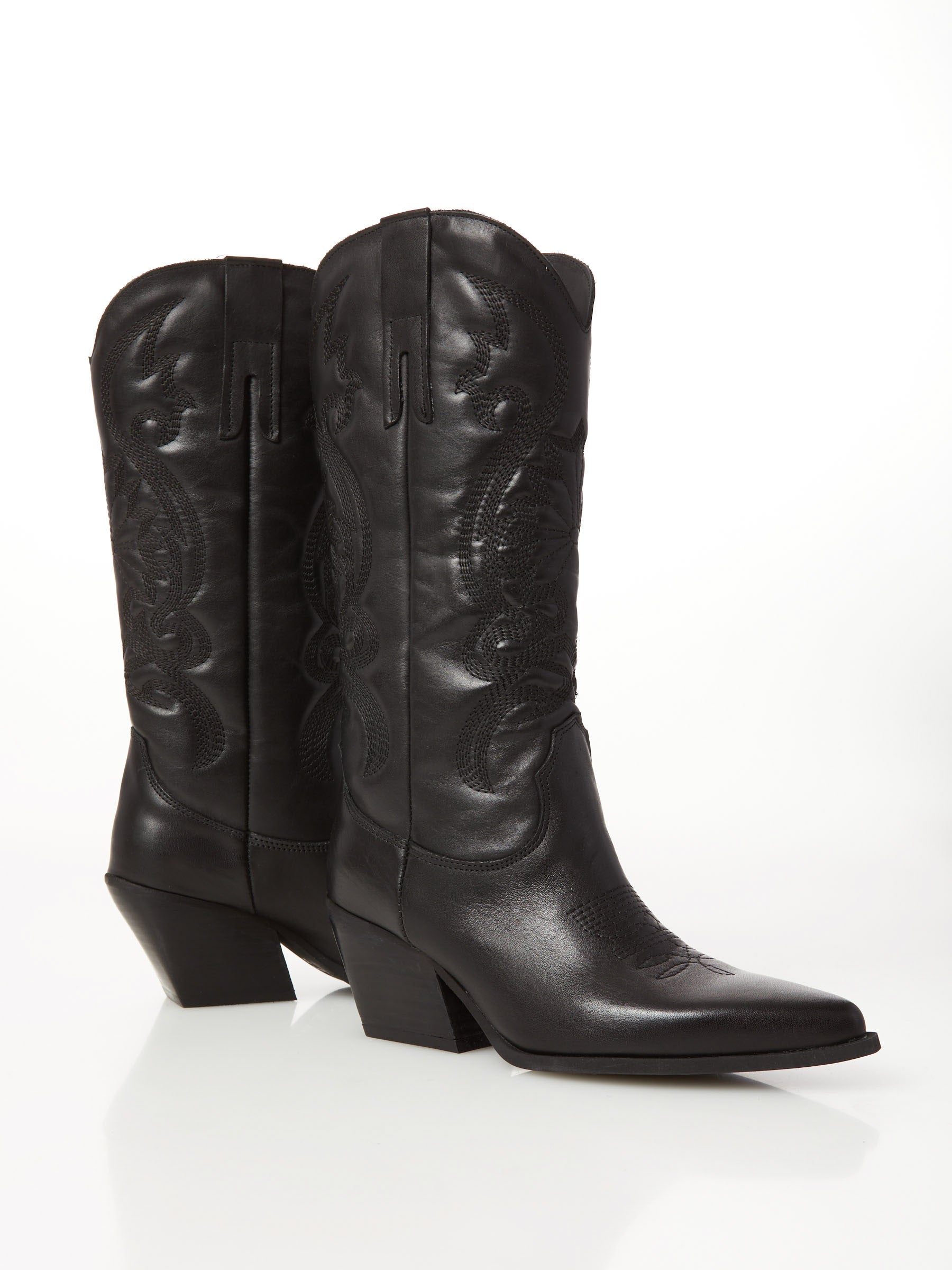 Experience the bold charm of our Embroidered Black Leather Cowboy Boots, the perfect blend of classic Western style and modern sophistication. Ideal for a variety of occasions, including parties, cocktails, office wear, or casual outings, these boots are a must-have for any powerful woman.