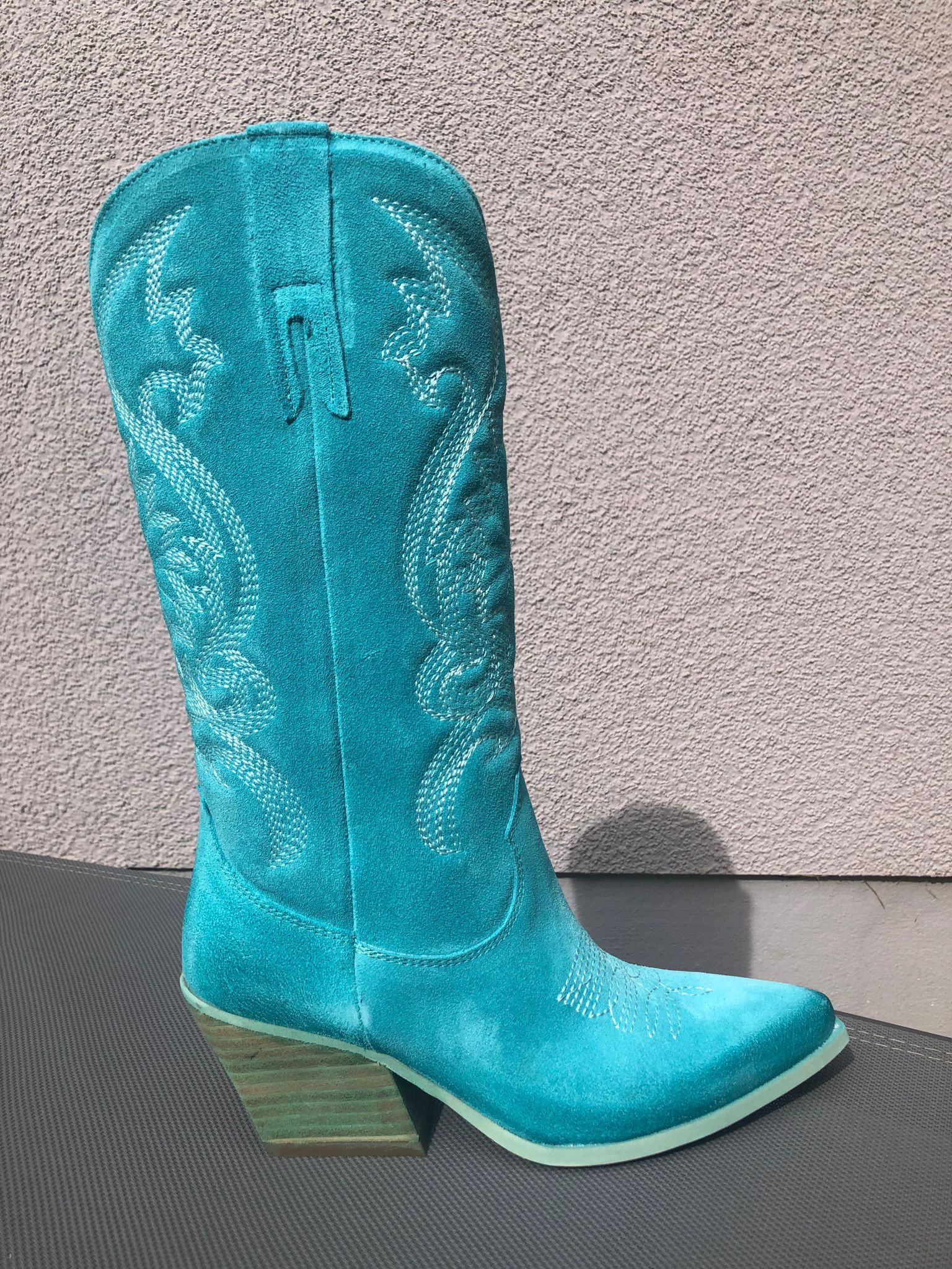 Elevate your style with our exquisite Western-inspired boots made of soft suede and adorned with intricate Italian design and sparkling rhinestones. These boots are perfect for any occasion and season, whether you're attending a glamorous event or simply going about your day. Make a statement and turn heads wherever you go.